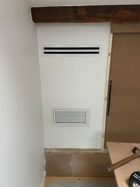 Les techniciens de Fournier ont étudié en détail la configuration des lieux pour optimiser le passage des gaines et l’implantation de la pompe à chaleur extérieure. Le défi principal était de concilier les contraintes techniques du bâtiment viticole avec la nécessité d’un système performant et économe en énergie. Résultat : une installation discrète, efficace et durable, parfaitement intégrée aux besoins de l’activité.